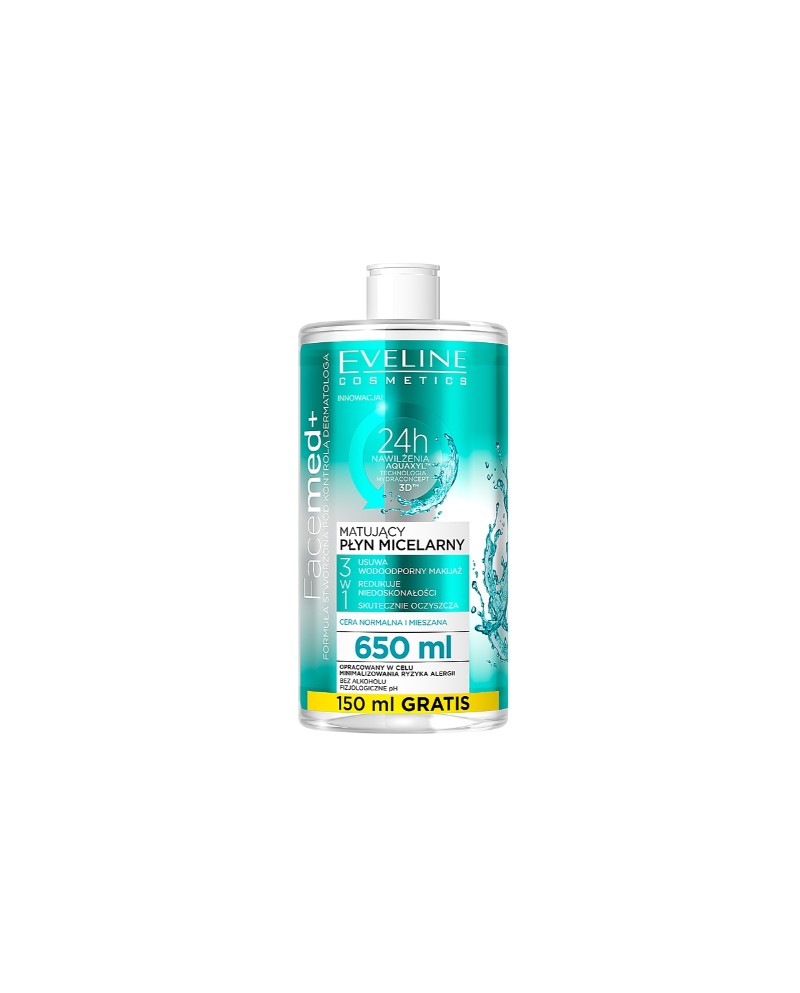Μήπως δεν έχετε τη δυνατότητα να κάνετε ένα σωστό καθαριζμο το οποίο θα καθαρίζει καλά το δέρμα σας και θα το φροντίσει; Το μικυλλιακό νερό Eveline Cosmetics Facemed+ Cleansing Micellar Water for Normal and Combination Skin εκμηδενίζει τον ενδεχόμενο αλλεργικής αντίδρασης, καθώς η σύνθεσή του είναι απαλλαγμένη από οινόπνευμα και έχει φυσικό pH. Αυτό το προϊόν προορίζεται για μικτό και λιπαρό δέρμα που έχει τάση υπερβολικής έκκρισης σμήγματος. Αποτελείται από το ενεργό βιοσύμπλεγμα Phycosaccharide® AC, το οποίο έχει ως βάση τον αντιβακτηριακό ψευδάργυρο και τα φύκια Laminaria digitata. Με την εφαρμογή της τεχνολογίας Aquaxyl το δέρμα αυξάνει το επίπεδο ενυδάτωσης και αποτρέπει την επαναφορά της ξηρότητας.