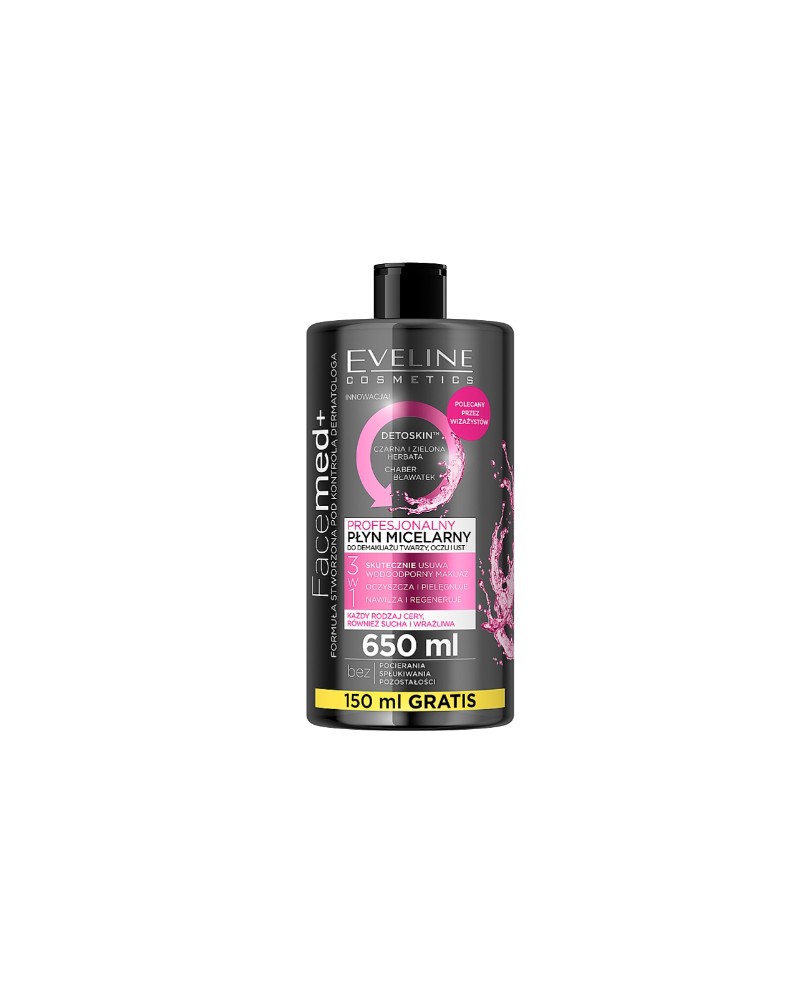Το νερό micellar της Eveline Cosmetics Facemed+ καθιστά το ξέβγαλμα του μέικ απ μία ευχάριστη και σύντομη διαδικασία .Περιέχονται σε αυτό μόνο φυσικής προέλευσης συστατικά όπως είναι το εκχύλισμα πράσινου και μαύρου τσαγιού, εκχύλισμα τουλίπας και αραβοσίτου, βιταμίνες και ενεργά μικκύλια.
